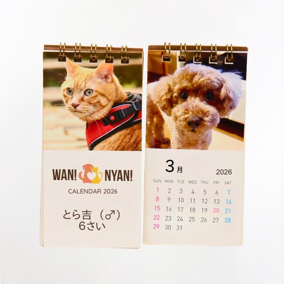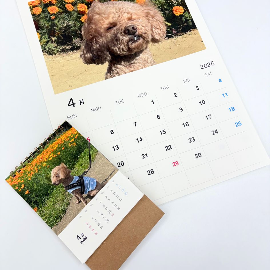 毎日をもっと特別に――お気に入りのペット写真で作る「オリジナルカレンダー」! デスクにぴったりの【スマホサイズ】、写真を楽しむ【ハガキサイズ】の2種類をご用意しました。 ここが魅力ポイント! ☆ちょっとしたスペースに飾りやすく、贈りやすいサイズ感 ☆使い終わった後も写真集として楽しめる ☆毎日目にするカレンダーだから、愛するペットに癒されるひととき 1冊からご注文可能! お気軽にお試しください。 この機会に、世界に一つだけのうちの子カレンダーを作りませんか? わんにゃんカレンダーについてはこちら